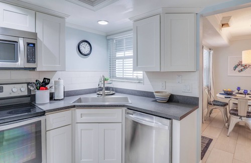 Inside, the home welcomes you with bright coastal décor, plush seating, and thoughtful touches throughout. The open-concept living room flows into the dining area and updated kitchen, featuring stainless steel appliances and everything you need to cook up a beachside meal. Both bedrooms are light-filled and inviting—the primary offers a king bed and ensuite bath with a walk-in shower, while the second bedroom includes another comfortable bed and easy access to a full guest bathroom. Each bathroom is modern and clean with a stylish walk-in shower for post-beach refreshment.