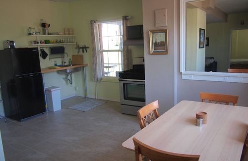 Cool, spacious, and modern ambiance in an historic mine building renovation. Each of our apartment conversions in this 100+ year old structure has its own distinct personality. 104 is bright, cheerful, modern and comfortable. Located on the ground floor, North East corner of the building, this apartment is sunny and bright in the morning and shaded in the afternoons. The big kitchen window looks out to the North and East with the red rocks of Sedona and Sycamore canyon in the distance.