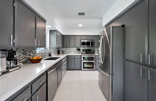 • Chef’s kitchen with stainless steel appliances, ample counter space, and breakfast bar