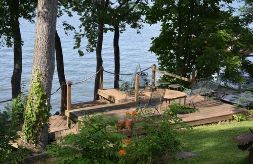 Our waterfront comfortable, mostly remodeled home is family-friendly and available to guests. It's a ranch-style brick house built in 1960 and situated in a family neighborhood in which many homes are vacation/second homes. Most rooms offer a beautiful view of lake. This relaxing, comfortable home sleeps 6 (5 traditional beds--a king, two doubles and two twins) and there's a queen-size hanging/swing bed on the screened porch.