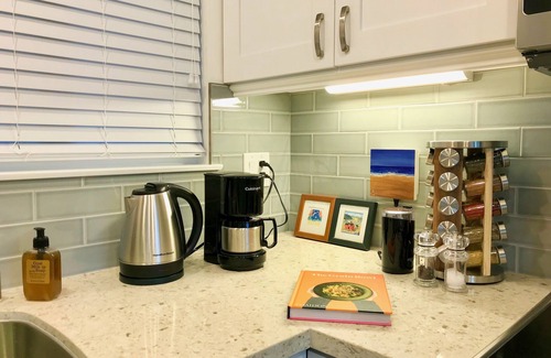 Start your day sipping gourmet coffee we provide while you look out over the beautiful village neighborhood. Get away from it all, and enjoy the sun and moderate temperatures in this well laid out and beautifully furnished condo. All new in June, 2018. In-unit washer and dryer. Sony 65” flat screen 4K Ultra HD Smart LED TV, Google Assistant. Master suite with king bed and 43" Smart TV, and USB equipped night stand lamps, second bedroom with queen bed. Both with Stearns & Foster brand new mattresses and luxury linens. Fully equipped top of the line bathrooms, one with built-in seating in the shower, plenty of plush towels, bathroom supplies, scale, and blow dryer for your conveniences. A brand new kitchen with state-of-the-art appliances, both major and small essentials. Loads of cabinets and drawers stocked with pots, pans, cooking utensils, plates, bowls, cups, tupperware, silverware, knives, wine glasses as wells as kitchen rags, paper towels, tissue, simple tools, and first aid kit. HVAC in the kitchen and living room, but you may never need it. Ceiling fans and wall heaters in both bedrooms. Wi-Fi, electricity, cable, water, trash, and the monthly village association fee are all included with no extra charges.