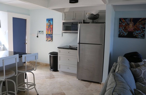 Our fully renovated unit offers an open-concept layout with equipped kitchen and living room on the main floor. Upstairs, the loft style master bedroom features a king size bed, full bathroom, and washer/dryer. Floor to ceiling windows make it a bright and inviting space with views of the Caribbean Sea and Buck Island. Open the new windows to take in the ocean breeze and view. Front and back patios also provide private outdoor spaces to relax.