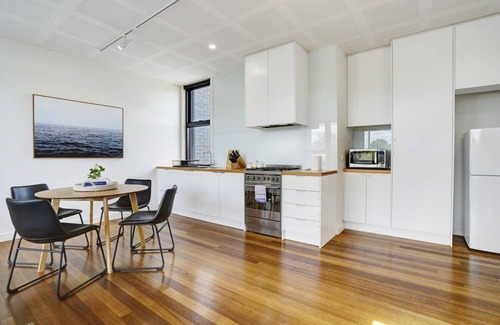 Free-flowing interior showcases two bedrooms (master bedroom with queen bed, secondary room with 2 single beds), stylish bathroom with added laundry facility. Add to this a modern kitchen with euro appliances along with an expansive and light-filled open living/dining area leading out to a terrace. Other highlights of the home include split-system heating and cooling, solid hardwood floors, and laundry.