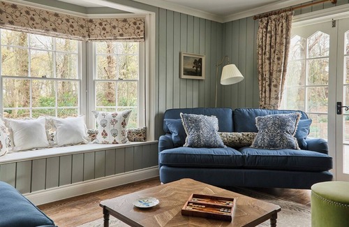 Nestled on the edge of historic Coombs woodland in the middle of Langham Hall Estate, Cosgrove Cottage provides an idyllic retreat for couples, families and groups of up to 7 people. This newly refurbished Victorian cottage has four bedrooms: one ensuite master, two doubles (or twins depending on preference) and a single. One of doubles is also downstairs. There are three beautifully appointed bathrooms, a fully-fitted dining kitchen including an honesty bar, wine fridge and coffee machine. The dual aspect, panelled living room with bay window and French doors to outdoor terrace has a fireplace with wood burner, sumptuous furnishing and large smart TV.