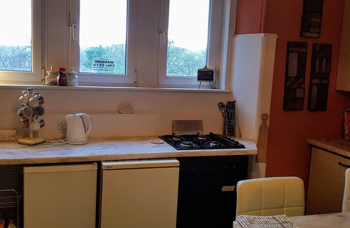 This three bedroom cottage was part of the former Carmelite Monastery. Set in over 2 acres of grounds and in the quiet leafy area of Kirktonhill. Close to the hills and Loch Lomond. Train station 10mins walk and frequent trains to both Glasgow city and Edinburgh. It sleeps five comfortably and has a large fully equipped kitchen. The living room is spacious and has a dinning area. Baby cot can and child seat be supplied. There are many attractions close by , such as the Denny ship building museum and Dumbarton Castle. The stunning views on the first floor are of the mouth of the Clyde and there is a park behind the property that leads to walks along the river. It is a 15min drive from Glasgow airport and 30mins by train to Glasgow's beautiful historic centre.