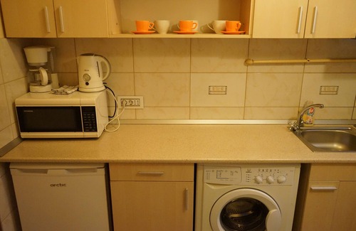 The apartment is located close to Radison Hotel (50m). The apartment is at the 7th floor in an 8-stored building. The building is equipped with elevator. Completely furnished apartment - fully equipped living room, bedroom, bathroom and kitchen. Living with sofabed and a table. Bedroom with queen size bed. Bathroom with bathtub.