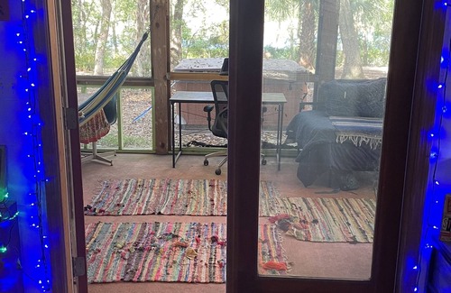 This intimate cottage offers comfort and light. It is a unique space with nine small aquariums and surrounded by a fenced acre of live oaks, pines, and flowering plants and bushes. It is a quiet and safe getaway for one person or a couple. There is a hot tub, BBQ, and outdoor seating to take in the beautiful view and listen to the birds and the quiet.