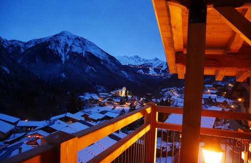 Cozy ambiance decoration with old wood and stone. Warm, bright, mountain view balcony on the Vanoise and Courchevel.