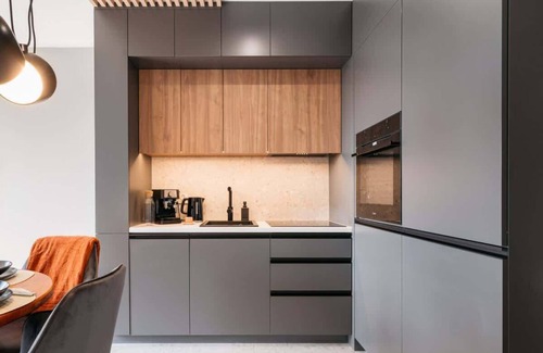 The apartment consists of a spacious living room with a sofa bed and a kitchenette with necessary equipment such as an oven, dishwasher, induction hob, a separate bedroom and a bathroom with a shower and a washing machine.