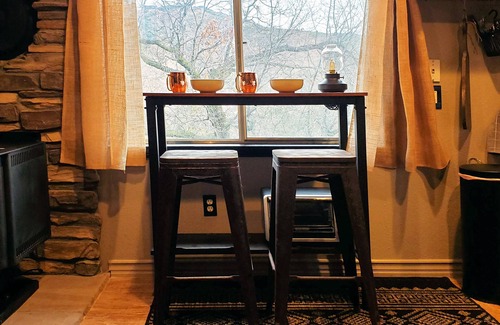 The Downstairs Den is the dark and moody alternative to its sister space just above, the 5-Star rated, Guest Favorite Dark Sky Den, and featured in LOCALE Magazine. Relax your senses in this contemporary, nomadic-style studio. The Interior Design is peppered with thoughtfully appointed details, custom and vintage accents, and natural materials and textures, along with dim, low-lit lighting that creates an ambience that feels exceptionally cozy.
