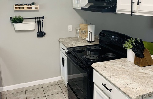 Enjoy fast Wifi and comfy beds all with private off street parking in rear! Both bedrooms have TVs with Roku. Watch 50” smart tv with blue ray player from a cozy couch. Relax with a nice shower or bath complete stocked with toiletries! Kitchen has every tool to cook a meal. Breakfast on the go and other snacks are stocked in cabinets and fridge. Feels like home . The only that is missing is you!