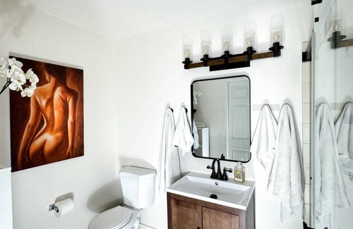 The large bedroom has a Queen sized bed with a full private bathroom with newly renovated shower