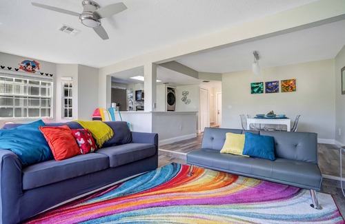 COMPLETELY *UPGRADED 3 Bed with Pull out couch some of the upgrades include: Luxury vinyl flooring, UPGRADED Kitchen: New Stainless Steel appliances, QUARTZ COUNTER TOP, FULLY EQUIPTED everything needed. FULL SIZE WASHER and DRYER, 65 inch living room 4k TV, Pullout couch, --- HARRY POTTER themed bedroom with queen memory foam bed and 50 inch 4k TV, --- MICKEY themed bedroom 2 twin beds with 50 inch 4k TV --- GLAMOR themed Master bedroom 58 inch 4k TV --- EVERYTHING UPGRADED. CLOSE TO DISNEY 11 miles and CLOSE to all THEME PARKS. GROCERY SHOPPING 1/2 Mile Away PUBLIX and RESTAURANTS
