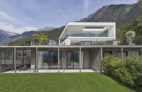 the view is characterized by simple elegance, clear design and luxurious living atmosphere in the best location. The apartment 'suite WHITE' is facing south with a view of the Merano countryside and has a large terrace with private garden. The frameless window fronts made of glass combined with high-quality materials provide an open feeling with a unique living experience. The transitions between interior and exterior disappear. The salt water infinity pool with a panoramic view of the surrounding mountain scenery rounds off the feeling of freedom. Overall, a lifestyle residence that meets the highest expectations and makes your holiday special.