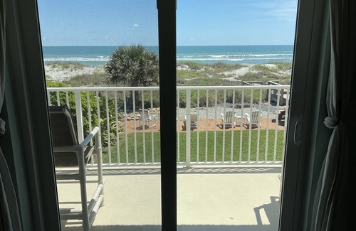 Quiet South Cocoa Beach area. A 2nd floor unit in a 4 unit condo building. Enjoy the tranquility and beauty of the direct Ocean view. This is a 2 Bedroom and 2 bath unit. 1 Bedroom has King size bed with master remodeled bath. 2nd bedroom has 2 double beds. Unit sleeps 6. Updated kitchen with all utensils that a cook would need. Disney World approximately 1 hour drive. Watch Rockets launch from the balcony. Port Canaveral 15 minutes drive to watch Cruise ships come and go or get on a Casino boat. 1 mile walk to Downtown Cocoa Beach. Enjoy walks on the beach day or night. Experience the beauty of the full moon light up the sky. This condo has everything a family needs. You will fall in love.❤️🥰