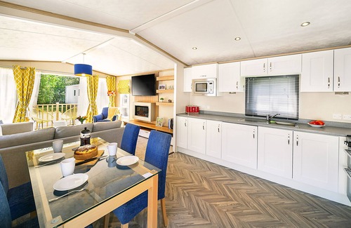 The lodge is bright and modern with an open plan layout. Full central heating. It is well equipped with everything you need for a comfortable self-catering stay. Lounge with smart 55" TV, double sofa bed, electric fire, windows in lieu of front doors leading to the patio deck. Kitchen diner with fridge & freezer, microwave, gas cooker-(oven/hobs) with separate grill with electric ignition, washing machine, dining table and chairs, 4-slice toaster, kettle, french press coffee maker, glass teapot with Infuser. Bedrooms, one king size bedroom, one twin bedroom. Bathroom, family bathroom with shower, separate en-suite basin and toilet.