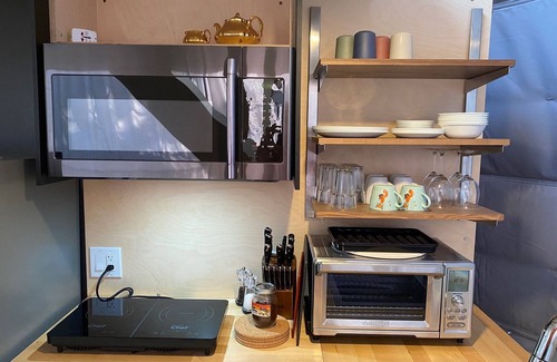 This dome is equipped with a full kitchen and bathroom, bedding and towels, a queen-size bed on the mezzanine, a sofa bed and a terrace with a gas BBQ (except in winter). We offer your first dose of locally roasted coffee, oil, sugar, salt, pepper and products from Percé's Poussière d'Étoile soap factory.