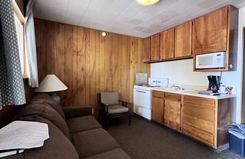 Discover the charm of Flaming Gorge in our cozy motel room. Featuring a plush queen bed and a fully-equipped kitchenette, it's perfect for both relaxation and convenience. Step outside to enjoy a tranquil yard, ideal for morning coffees or evening relaxation. A blend of comfort and scenic beauty awaits in this Utah gem.