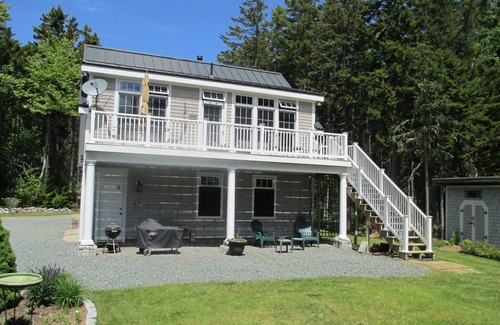 Duck Cove Cottage - If relaxation, peace and quiet are part of the agenda, Duck Cove Cottage may help achieve that goal. This waterfront, 1 bedroom carriage house can be ideal for the couple that wants a base to explore Down East, tour Acadia(1 hour away), attend the Wooden Boat School(5-7 min), or just sit in the chairs by tranquil, tidal Herrick Bay for your time here. The bird life on the bay, an occasional eagle soaring by or the red squirrels dashing through the trees are your closest neighbors. Besides a spacious living area it has a fully equipped kitchen, king bed in the bedroom, sleeper sofa in the living area, walk in closet, 1 bath, 2 dressing areas, and washer- dryer utility area in the 850 sq feet. The deck overlooks the bay and offers a very tranquil atmosphere situated on 4 peaceful acres. Our residence is adjacent to the cottage but is not connected to the carriage house. The house is not on the rental market, and if occupied, we would be there.