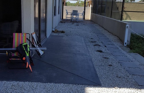 The bedroom has a very comfortable king bed with a TV and 2 closets. There is a large open kitchen fully stocked for your cooking convenience. There is a living/dining room with a table and 4 chairs, a TV and 2 futons that open up to serve as extra double beds. The Unit is equipped with Cable as well as WiFi. There is a full size washer and dryer. The patio is very large and L shaped with a deck box for beach toys, as well as, beach chairs and an umbrella. There is a high top table and 4 chairs with a view of the ocean, a perfect spot for morning breakfast and coffee. Binoculars are provided for the often sighted dolphins. Please note: Our unit is next to the tennis courts which are rarely used (see photo).