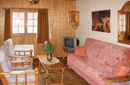 3-room chalet 45 m2. Rustic and cosy furnishings: living/sleeping room with 2 fold-away beds, dining table and cable TV (flat screen). 2 rooms, each room with 2 beds. Open kitchen (3 hot plates, oven, electric coffee machine, fondue Set (cheese)). Shower/WC. Electric heating. Carpet. Patio. Terrace furniture. Parking (1 car) at the house. Maximum 1 pet/ dog allowed.