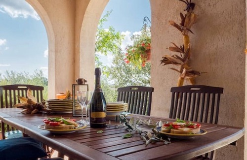 In the rolling hills and dramatic calanchi of the tranquil Umbrian countryside, down a dirt road, beyond a picket gate, you will find a welcoming country house sitting serenely on a hill, surrounded by 10 very private acres (3 hectares), with sweeping views and enchanting sunsets.