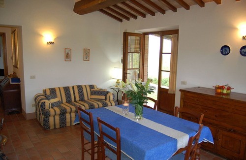 Located down a short private road in an area of Tuscany known for private country homes and expansive views of pastoral countryside dotted with stone houses, woods, vineyards and farm fields, the villa is ideal for a small group or family traveling together.There are three bedrooms and two baths all on a single level. One bedroom has a queen bed and the other two can be either 2 single beds or 1 king bed as you prefer. One bedroom has an en-suite bath and the other two share a hall bath, both with showers. The floors have a warm terracotta patina and the ceilings are hand carved wood-beams. A lovely combination of both old and new throughout.