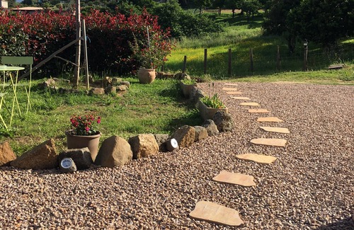 Beautiful garden for lunch or dinner with lounge and barbecue. View of countryside and mountains.
