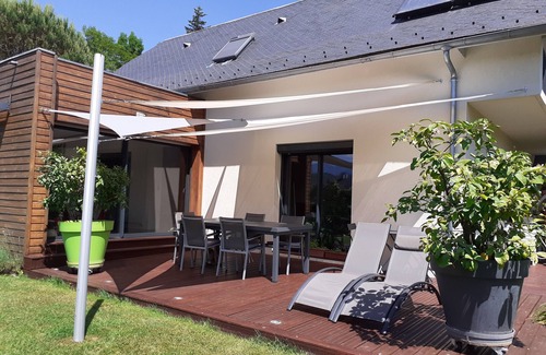 In a small village, a true haven of peace at the foot of the Pyrenees, 5kms from Bagneres de bigorre and 15kms from Tarbes and Lourdes, magnificent house in a large wooded park, very comfortable with a very large kitchen dining room, a large room living with living room, fireplace and television corner, 3 bedrooms each with a double bed + a landing / mezzanine with 2 90 cm beds, 2 bathrooms, 2 separate toilets, a large wooden terrace with garden furniture and sun shades 'shade and plancha.
