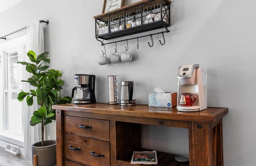 The kitchen will be stocked with everything (except food) you need to make and serve a meal for a large group. You shouldn’t need to bring kitchen items from home unless there’s something special you don’t travel without! Ask if you have any questions. There is a second refrigerator in the garage. Plan to bring ice if you want it for drinks or coolers.