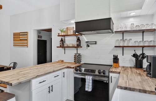Inside, you'll find the perfect balance of rustic character and updated convenience. Gather around the large dining table for meals and memories, or unwind in the cozy living room with friends. The fully equipped kitchen makes group meals a breeze.