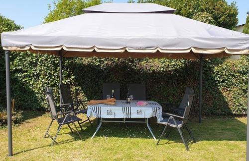Outside there is a stone BBQ and an outside dining area under the gazebo - a lovely place to enjoy those warm evenings. The heated pool is set at a balmy 28 degrees so that it can be used, even on those cooler days, and is checked daily. The garden is fenced and there is a pool alarm. The front field is just the place for the kids to burn off all that excess energy while you relax by the pool.