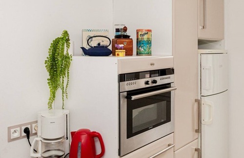 -> A dining area and a fully equipped kitchen with a stovetop, microwave, oven, refrigerator, dishwasher, toaster, filter coffee maker, Senseo coffee machine, and kettle. Everything you need to cook is provided. A welcome kit is offered, including tea, coffee, sugar, and cookies.