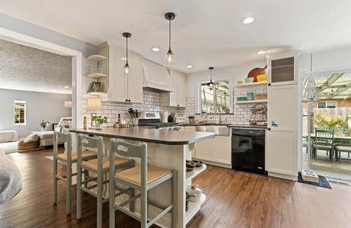 The living space extends to outdoors, you walk out to a covered patio with a large custom refinished dining table and luxurious patio seating. The outdoor space has everything you need, a bin for toys and yard games in the lawn. It also has a garden space with herbs, fruits, and vegetables! All available for you during your stay!