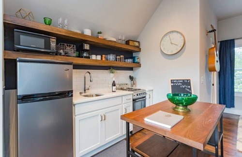 Downtown Private Guest Loft with Cool Vintage Vibes! Jam on the guitar, spin some classic vinyl, or check out the country album covers on the wall to get into the Nashville groove. Here, the brightness of the decor is matched only by the quality of the bed linen and the comfort of the new sleeper sofa.