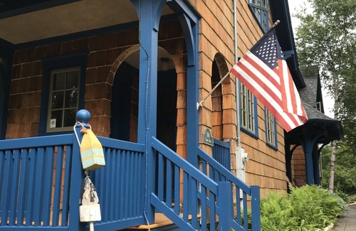Surrounding the house are lush gardens and lawns complete with a fire pit. The front lawn comes with a full turning circle and multiple parking spaces. The front gate is made by a local artist in the Adirondack camp style. We've left a ping pong table on the porch for your enjoyment.