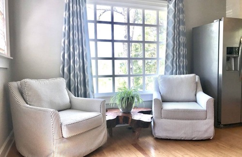 The Farmhouse was recently renovated and designed with a Bed and Breakfast type layout in mind. Though it has the ability to accommodate several parties, this listing is for the entire house and perfect for a group of 8 or less. On the bottom level you'll find 2 bedrooms, each with a queen sized bed and over sized bedrooms. Each room has a TV with streaming services such as YouTube TV and a bathroom off the hallway of each room, with a clean spa-like feel. Also, on the bottom level is one (1) full kitchen and a wet bar, breakfast area. One is a full sized, fully equipped kitchen with a large dining table (seats 8), a large flatscreen tv, and a seating area beneath a beautiful bay window overlooking the incredible views of the mountains. The wetbar/breakfast nook has a full-sized fridge and seating for 2. Off of both the kitchen and breakfast nook, is the back deck with a dining table looking out towards the Blue Ridge. Up the stairs, just off the small kitchen, you'll find 2 more bedrooms with a shared bathroom. Both rooms have queen sized beds and smart TVs.