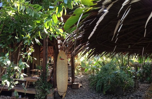 An open cool spaced two story wooden and bamboo house with natural jungle garden setting, ponds, and hang out areas. We do a pizza for travelers when we are there but mostly people are let to themselves . Very close to the reef break and 30 meters from the beach. Largish property and private and safe setting... top room is open but guests can lock valuables in a closet.. Bottom room has its own key. Shared bathroom and kitchen facilities