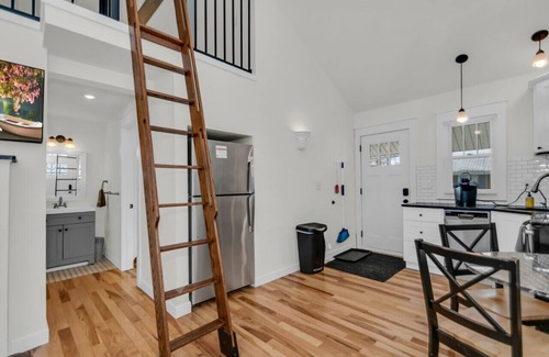 Welcome to “Ontario” one of 6 Boutique Cottages at the Herons Nest! 1 bedroom, 1 bath with sleeping loft featuring a Twin XL platform bed. Step inside to discover beautiful hickory hardwood floors and modern, tiled bathrooms, as well as your own private deck with a grill for outdoor dining. Our open concept floor plan features a full kitchen with stove, microwave, refrigerator and dishwasher. The living area boasts a Queen Size sofa sleeper. This cottage will comfortably sleep 4.