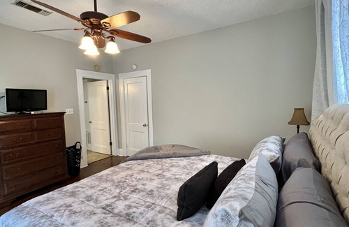 This spacious 1 bedroom apartment is centrally located in the Historical Highland area of Shreveport. It is near everything great shopping, good restaurants and more. There is a comfy king bed and air mattress in the living room. Additionally, an in-unit washer and dryer, large living room, private entrance, free parking, self-check-in, full bathroom and a full kitchen.