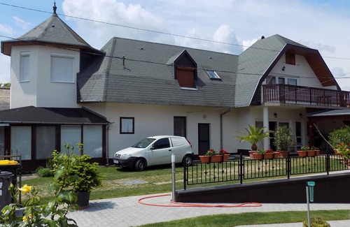 The holiday apartment is located in a single-family home, was renovated in 2014 and is furnished in a typical country style. Also due to its quiet and sunny location the domicile is popular. Available for shared use: parasol, sun lounger, children's playground, terrace, pavilion and garden furniture.LocationGyenesdiás. The holiday apartement is located on a enclosed garden plot with meadow, flowers and shrubs, bordered by a fence. The landlord lives permanently in the house, but uses a seperate entrance. BAL GYE 079 (4 P) and BAL GYE 080 (7 P) are located on the property. Access is via a side road. Parking is available on the property. Specialair conditioning, central heating (gas).Facilities: internet access (WLAN). TV reception takes place via electric wire. PoolAll pools are available for shared use. Outdoor pool (usable from early June to end of August, diameter 4,6 m, depth 1 m). Dogsnot allowed. DistancesShopping 400 m, restaurant 400 m, town center 450 m. thermal bath in Hévíz 10 km. In summer: Balaton 600 m in Gyenesdiás (beach 600 m in Gyenesdiás featuring meadow). Gyenesdiás: horse riding 1000 m, tennis, mini golf each 500 m. fishing, boat rental each 600 m. DivisionHoliday apartment, 1 floor, 3 rooms (including 3 bedrooms), 100 sqm, in total 6 beds. Room Bedroom with 2 single beds, 1 additional bed on bed (smaller 2.00 x 0.90 m) and access to the balcony. 2 bedrooms each with 2 single beds. Kitchen with dining area, electric stove, oven, fridge (icebox), microwave, coffee machine and toaster. Anteroom with sitting area and TV. 3 bathrooms each with shower, 1 washbasin and WC. Terms of lease and pricesIncluded in the priceOutdoor pool, internet access, parking place, electricity, gas, water, final cleaning, bed linen, sunloungers, Wireless Internet access. Side costs-Costs on the spot:/Obligatory:local tax by local tariff.On request:air conditioning 5 € per object per day.Deposit:No deposit.