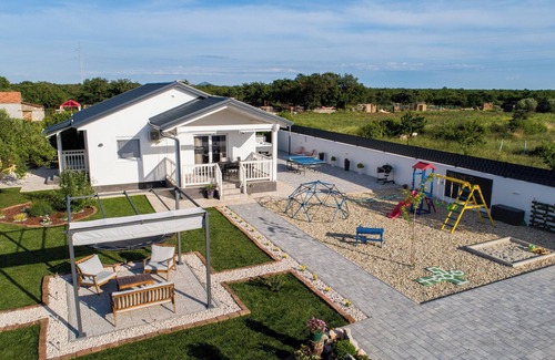 Holiday house "Aprilis" is located in village Galovac not far from Zadar (15km). It is located in a fenced plot with green areas, and guarantees intimacy. It has its own garden, where guests have a barbacue, lounger, private jacuzzi,private outdoor sauna and playground.Pool is also located on the property(shared with one more apartment). The house has a separate road and a private parking. Vacation in the "Aprilis" guest house offers you to relax from the stress and the crowd at the peak of the season. It is ideal for families with children.