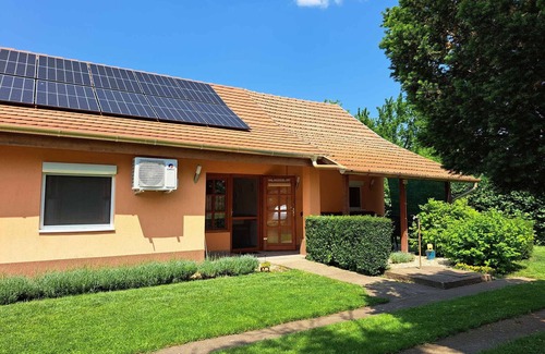 3 stars, 4 beds, reception (24 hour service) and internet (WLAN). LocationTiszafüred, 100 m above sea level. The holiday home is located in a residence, on a 1200 sqm, closed garden plot with meadow, flowers, bushes and trees, limited by a fence and a hedce. The access goes via a side road (rubble or gravel). Parking lot on the property and a parking lot in the village. Specialair conditioner. Facilities: internet access (WLAN). TV reception takes place via electric wire. TV channels only in local language. PoolOutdoor pool (heatable, 3 m x 7 m, depth 1,1 m, for common use). The pool facility can be used all year around. Indoor swimming pool (heatable, 2 m x 2 m, depth 0,8 m, usable all year around, for common use). WellnessIn the complex: whirlpool and sauna. LeisureIn the complex: table tennis. badminton Dogsallowed, HUF 4000.00/pet per day. DistancesShopping opportunity 1000 m, restaurant 1000 m, town center 1500 m. airport in Debrecen 68 km. Tiszafüred: pharmacy 1000 m, thermal bath, bank each 1500 m. doctor 2 km and railway station 3 km. Children's playground 1000 m.In summer: Theiss See 2 km in Tiszafüred (private beach 2 km in Tiszafüred with meadow). Tiszafüred: dog beach, fishing, water sports, boat rental each 2 km. horse riding 3,5 km. DivisionHoliday home, 1 floor, 2 rooms (including 2 bed rooms), 56 sqm, in total 4 beds. RoomThe entrance in your holiday home is located on the ground floor, is at ground level and leads over the terrace directly in the kitchen. Bedroom (14 sqm) with 2 single beds and TV. Bedroom (16 sqm) with 1 double bed, TV and access to the terrace. Kitchen with dining area (5 seats), electric stove (induction cooker, 2 plates), dishwasher, fridge (icebox), microwave, coffee machine, toaster, electric kettle and access to the terrace. Bathroom with shower, 1 sink, WC, hairdryer and window. Terms of lease and pricesIncluded in the priceair conditioning, parking place, electricity, gas, water, final cleaning, bed linen, hand towels, Wireless Internet access. Side costs-Additionally(Payable when booking)/local tax.Deposit:No deposit.