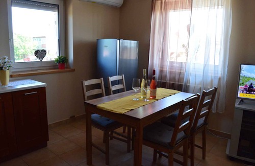 The holiday home built in 2011 and is furnished in a modern style. Also due to its quiet location the domicile is popular. Available for use: sunbathing lawn, parasol, sun lounger, barbecue facilities, garden furniture and courtyard.LocationGyenesdiás. The holiday home is located on a 850 sqm enclosed garden plot with meadow, flowers, shrubs and trees, bordered by a fence. The landlord lives permanently in the house, but uses a seperate entrance. Small dog is allowed. The landlord also has a friendly dog. OTP Szép Kártya possible Access is via a side road (asphalted). Parking (for 2 cars) is available in a carport and on the property. Specialair conditioning, central heating (gas).Facilities: internet access (WLAN). TV reception takes place via electric wire. Dogsnot allowed. DistancesShopping 300 m, restaurant 400 m, town center 400 m. Gyenesdiás: cinema 100 m, sauna, pharmacy each 1000 m. bank 1200 m and doctor 600 m. thermal bath in Kehidakustány 15 km. Keszthely: railway station 3 km and indoor swimming pool, discotheque each 4 km. Railway line 600 m. Children's playground 500 m. Hévíz 6000m In summer: Balaton 500 m in Gyenesdiás (beach 500 m in Gyenesdiás featuring meadow, sand and gravel). golf in Balatongyörök 8 km. Gyenesdiás: tennis 1000 m, mini golf 1300 m and horse riding, fishing, boat rental each 500 m. dog beach in Keszthely 3,5 km. water sports in Vonyarcvashegy 3 km. DivisionHoliday home, 1 floor, 3 rooms (including 2 bedrooms), 77 sqm, in total 6 beds (including 2 additional beds). RoomThe entrance to your holiday home leads over an internal staircase directly into the porch with doors to all rooms. Bedroom (11 sqm) with 1 double bed. Bedroom (13 sqm) with 1 double bed. Eat-in kitchen (34 sqm) with 2 additional beds on couch/sofa, sitting area, TV, dining area (6 seats) and access to the balcony (garden furniture). Kitchen in the kitchen-diner with TV, dining area (6 seats), gas stove, oven, dishwasher, fridge (icebox), microwave, coffee machine, toaster, electric kettle and access to the balcony. Bathroom (5 sqm) with shower, 1 washbasin, WC and window. Terms of lease and pricesIncluded in the priceinternet access, parking place, electricity, gas, water, final cleaning, bed linen, sunloungers, Wireless Internet access. Side costs-Costs on the spot:/Obligatory:local tax by local tariff.On request:air conditioning 4 € per object per day.Deposit:EUR 100,-/object
