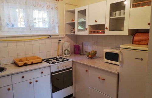 The detached holiday home is furnished in a functional style. The property is located in a holiday home settlement, in the town centre. Also due to its quiet and sunny location the domicile is popular. Available for your exclusive use: sunbathing lawn, parasol, barbecue facilities, terrace and garden furniture.LocationZalakaros. The holiday home is located on a enclosed garden plot with meadow, flowers, shrubs and trees, bordered by a fence. The landlord does not live in the house or on the property. Quiet, green location Access is via a side road (asphalted). Parking (for 1 car) is available on the property. SpecialFacilities: internet access (WLAN) and iron. TV reception takes place via satellite. TV programme in DEFor your safety, the accommodation is equipped with smoke detector. Dogsallowed, EUR 5.00/pet per day. DistancesShopping 200 m, restaurant 150 m, town center 200 m. thermal bath in Zalakaros 300 m. Sármellék Airport 18 km. Bus stop 130 m. In summer: fishing in KisBalaton 8 km. DivisionHoliday home, 2 floors, 3 rooms (including 1 bedroom), 50 sqm, in total 4 beds. RoomThe entrance to your holiday home is located on the ground floor and leads over the 15 sqm terrace directly into the living room.Ground floor: Living room with sitting area, TV, dining area (4 seats) and access to the terrace (9 sqm, covered, garden furniture). Kitchen with gas stove, oven, fridge (icebox), microwave and coffee machine. Bathroom with shower, 1 washbasin and WC. Upper floor: Bedroom with 1 double bed. Eat-in kitchen with 2 single beds. Separate toilet with WC. Terms of lease and pricesIncluded in the priceinternet access, parking place, electricity, gas, water, final cleaning, bed linen, Welcome drink, Wireless Internet access. Side costs-Costs on the spot:/Obligatory:local tax by local tariff.On request:heating 2 € per object per day (28.03.26-25.04.26).Deposit:EUR 50,-/object.