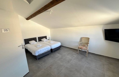 The second floor offers a similar layout: a modern bathroom with sink, shower and toilet, as well as two additional bedrooms, also with two single beds and a smart TV.