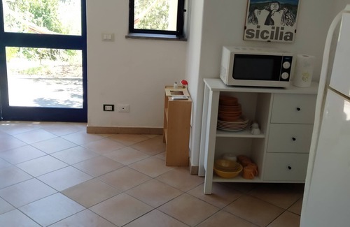 The living room has large windows overlooking the garden, a cooking area, fridge, microwave, table for 6, sofa bed for 2. The bedroom has a double bed and a chest of drawers. The bathroom, with window, is equipped with shower. The large terrace in front of the house is dominated by a carob tree that provides shade and refreshment during the hottest hours. The large garden available to guests has fig trees, almond trees, plums and mulberries. Private parking near the house.