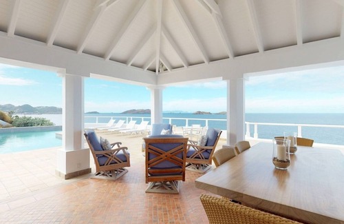 This luxurious villais one of the most iconic homes in town. It is the ideal place to enjoy a vacation with the ocean in sight and the daily spectacle of the sunsets on the horizon. Built in a charming mix of both a Mediterranean and a Caribbean design, the villa opens onto a panoramic 270-degree sweeping vistaall the way from the island's leeward side, to the west, to the bay of Grand Cul de Sac to the east.The Christopher Hotel and its restaurants are also only a few steps away from the villa whenever you wish to dine out.
