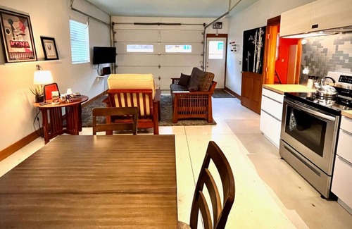 Discover a one-of-a-kind, modern, and convenient getaway! This remarkable conversion of a historic garage offers a unique stay. The roll-up door in the living room allows you to embrace the outdoors. On the other end, you'll find an attached garage with EV charging.
