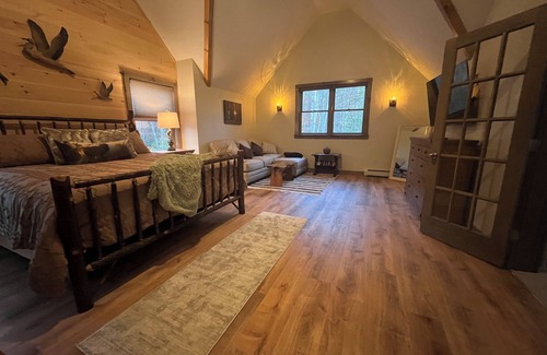 Saunter upstairs past the loft overlooking the great room to a magnificent master suite with its own private sitting area. Envision French doors, vaulted ceilings, accent plank walls, a king sized hickory bed, piled high with cozy comforters and antique touches! In this 500 sq foot bedroom, there is a large wall mounted TV with couch and ottoman allowing plenty of space to to have some ‘private’ time. Set high among the pines, this suite is truly a room for the senses!